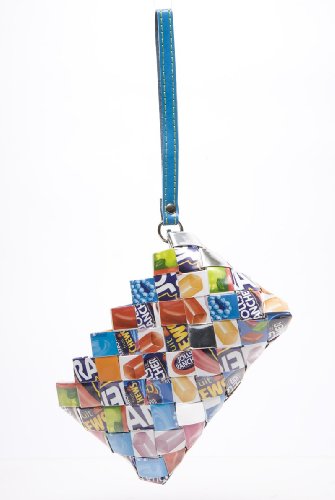 This Nahui Ollin Baby Cakes Candy Wrapper Bag is made from recycled materials. It can take up to 4000 wrapper and 4 days to construct one bag! Be Eco-fashionable and own a one-of-a -kind piece today. This cute pouch fits right on your wrist and is perfect to fit the essentials such as your keys, credit cards, phone or makeup. The zipper closure and leather wrist strap help keep your items safe and secure.