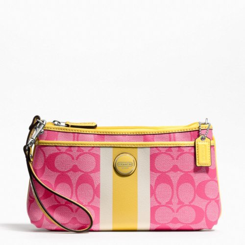 COACH SIS PVC Signature Stripe Large Wristlet Converts to Top Handle in Pink / Yellow 49090 by