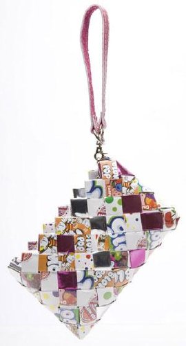 This Nahui Ollin Baby Cakes Candy Wrapper Bag is made from recycled materials. It can take up to 4000 wrapper and 4 days to construct one bag! Be Eco-fashionable and own a one-of-a -kind piece today. This cute pouch fits right on your wrist and is perfect to fit the essentials such as your keys, credit cards, phone or makeup. The zipper closure and leather wrist strap help keep your items safe and secure.
