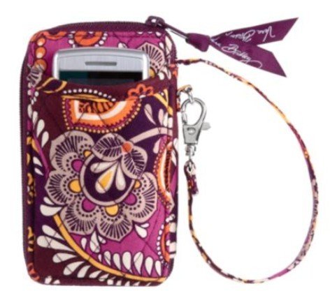 Now you can have it all, right in the palm of your hand. Slide your cell phone or music player in the back pocket and your ID in the front window. Inside there are three credit card slots, a pocket and a zippered compartment. A strap clasp makes it easy to attach to another bag. Give it a hand!Read more Vera Bradley All in One Wristlet in Safari Sunset