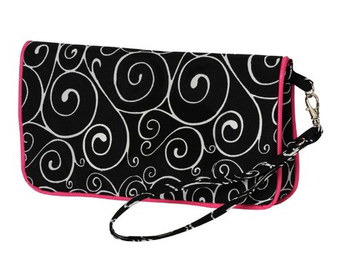 Find for item features and simillar products of Black and White with Pink Trim Swirl Wristlet. Help in your choosing.