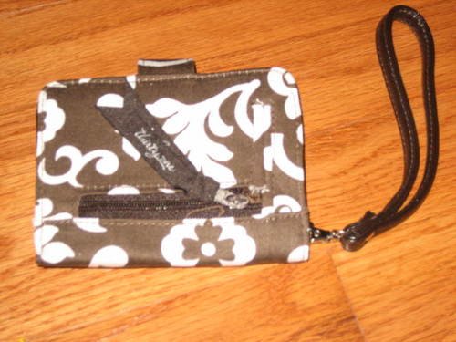 Approx: 3.5" H x 4.5" W x 1.5" Deatures: outside zipper pocket, magnetic closure, inside pockets (one larger with alphabetical cards and one flat), license holder, lobster claw wristlet.